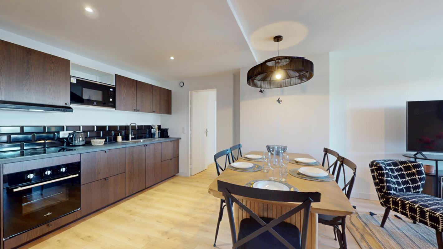 Une cuisine entièrement aménagée et équipée s'ouvre sur le salon.