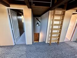 A l'étage : un grand dégagement, deux belles chambres dont une avec rangement, un dressing et une mezzanine.