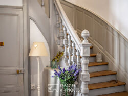 A proximité de la place du Lycée, recherchée pour ses commerces et son ambiance familiale, cet élégant duplex dévoile une surface habitable de 269 m² avec pour écrin un extérieur joliment paysagé. Situé au rez-de-chaussée d'un ancien hôtel particulier, derrière un porche clos à l'accès restreint, ce bien rare allie avec raffinement les prestations contemporaines de qualité et le charme de l'ancien. L'accès direct par la cour offre une impression de maison indépendante au sein de la petite copropriété. Le lieu révèle une belle hauteur sous plafond et séduit par son élégance intemporelle. La réécriture contemporaine s'accorde harmonieusement avec les éléments d'origine omniprésents, tels les parquets, boiseries, moulures et cheminées. La vaste entrée, ornée d'une bibliothèque, laisse libre court à un espace bureau. Deux superbes portes haussmanniennes s'ouvrent sur les pièces de réception, lumineuses et aérées, ponctuées de cheminées en marbre ornementées de miroirs. Récente et de belle facture, la cuisine aménagée et équipée dispose d'un comptoir central laissant augurer d'agréables moments de partage en famille. Dans son prolongement prend place l'arrière-cuisine pour une praticité quotidienne. Un remarquable escalier mène à la pièce palière du premier étage dédié à l'espace nuit. Il abrite quatre chambres baignées de lumière, dont une spacieuse suite parentale agrémentée d'une salle d'eau privative et dressing, une chambre avec salle d'eau privative, deux chambres ainsi qu'une salle d'eau. Ces différentes pièces, rythmées de boiseries et parquet, ont préservé un cachet indéniable. La copropriété propose par ailleurs un bel espace extérieur soigneusement aménagé et paysagé invitant à profiter de la quiétude du lieu.. Trois belles caves et une chaufferie complètent ce bien, ainsi qu'un garage fermé à proximité. Par son emplacement privilégié, son cachet et sa rénovation de qualité, ce refuge urbain se distingue comme un bien atypique. Il séduira les amateurs de lieux singuliers, en quête d'un cadre de vie confidentiel au coeur de la ville. A seulement dix minutes à pied de la gare TGV Angers-Saint-Laud. CLASSE ENERGIE : D / CLASSE CLIMAT : D. Montant moyen estimé des dépenses annuelles d'énergie pour un usage standard établi à partir des prix moyens des énergies indexés sur les années 2021, 2022 et 2023 (abonnements compris) : entre 5 073 euros et 6 863 euros. Trois lots d'habitation. Charges annuelles : 2 404 euros. Pas de procédure en cours. Contact : Valérie 06 02 18 65 59 EI - Agent commercial immatriculé au RSAC Angers n° 512 543 166 Les honoraires sont à la charge du vendeur. Les informations sur les risques auxquels ce bien est exposé sont disponibles sur le site Géorisques pour les zones concernées : www.georisques.gouv.fr Copropriété de 3 lots - dont 3 lots habitation. (Pas de procédure en cours). Charges annuelles : 2404 euros.