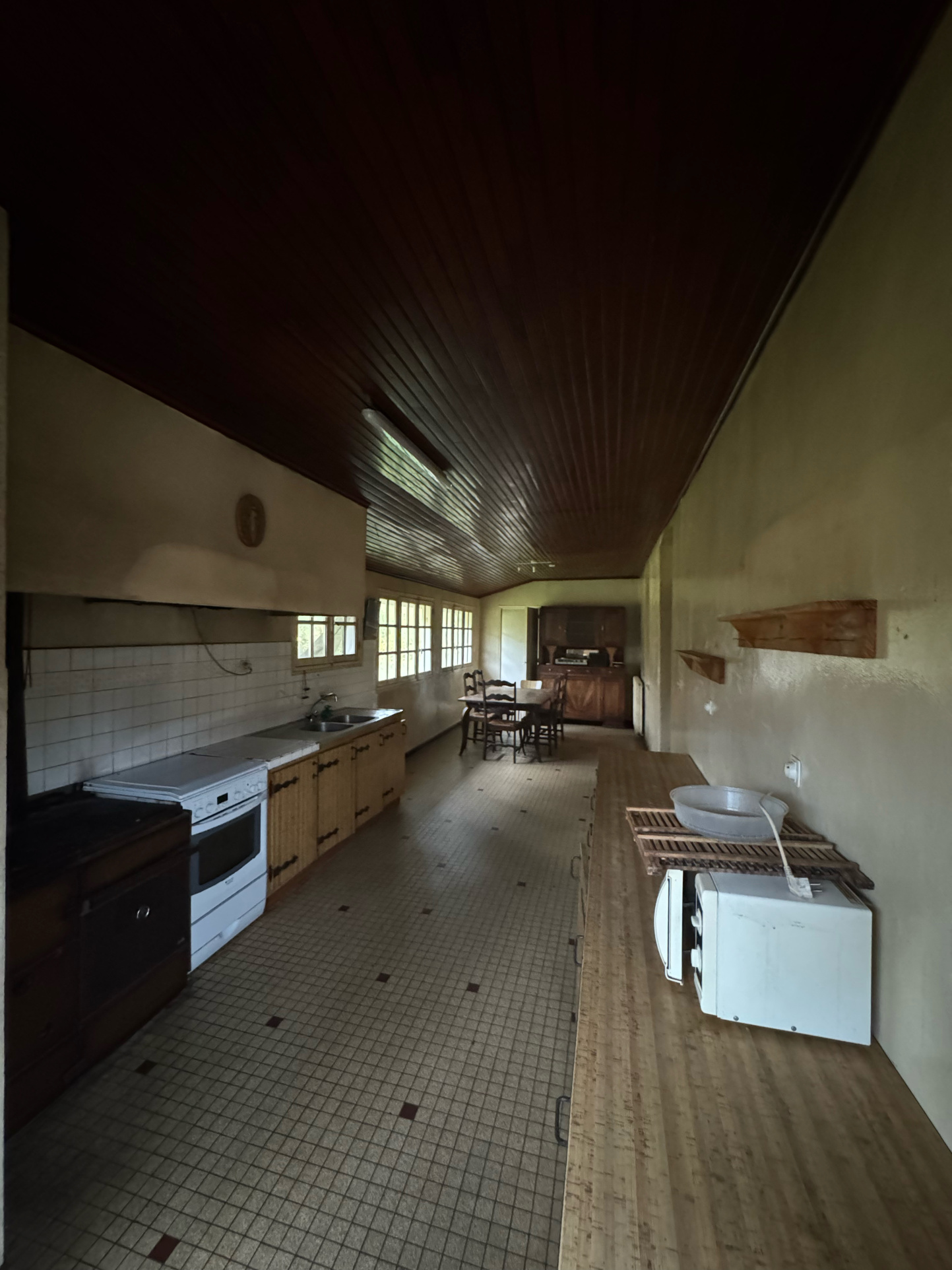 Vous trouverez dans la maison principale une salle à manger de 32m2, une cuisine de 19m2, un cellier de 13m2 et une chambre de 23m2 avec point d'eau.