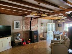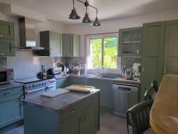 Rez-de-chaussée : sas d'entrée, hall avec dégagement, vaste séjour-salon d'environ 36 m² avec poêle à granulés, cuisine aménagée et équipée semi-ouverte avec îlot central, 1 chambre et WC avec lave-mains.