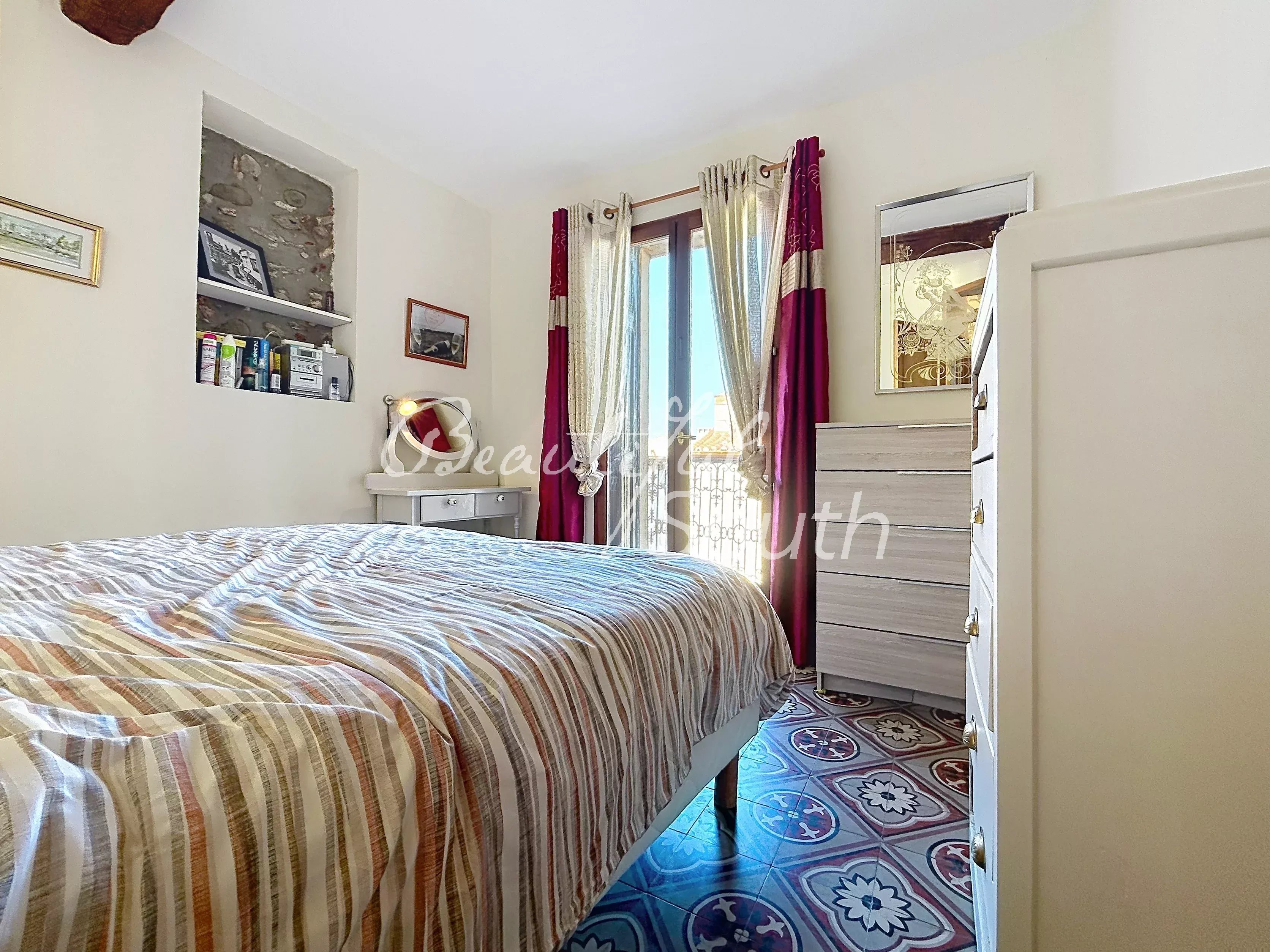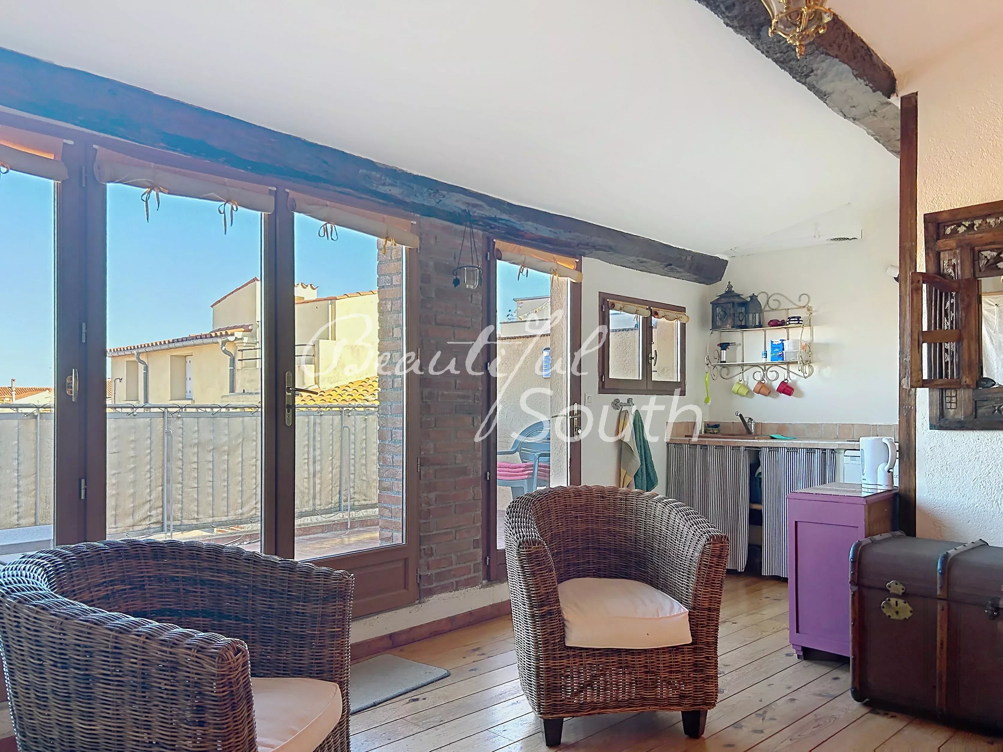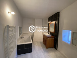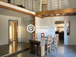 Belle pièce de vie avec plafond cathédrale et mezzanine , cuisine équipée, salon, chambre, salle de bains avec douche et baignoire. En rez de chaussée, un garage facile d'accès, une buanderie et un espace dressing complètent cette ensemble. Le plus ! une terrasse avec vue panoramique sur le clocher d'Ille-sur-Têt, les Orgues et le Canigou.