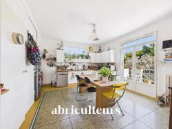 Cuisine généreuse ouvrant sur une grande terrasse.