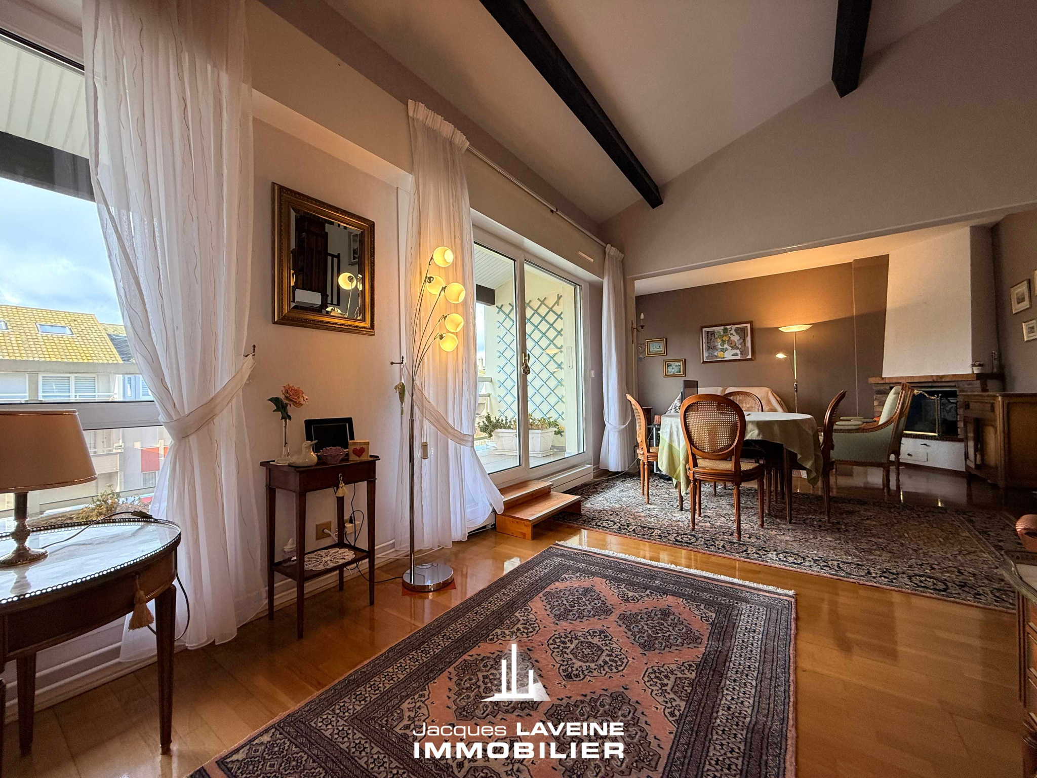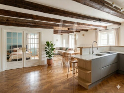 L'espace s'articule autour d'une pièce de vie généreuse avec cuisine ouverte, créant un volume de réception chaleureux avec ses poutres apparentes. Le coin nuit se compose de deux grandes chambres, complétées par deux salles de bains et deux WC. L'appartement dispose également de nombreux rangements intégrés facilitant l'organisation quotidienne.