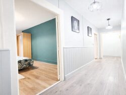 Il se compose d'une cuisine aménagée et entièrement équipée (four, plaque de cuisson, hotte, réfrigérateur combiné, micro-ondes), d'un salon, d'un dégagement desservant deux grandes chambres, d'une salle de bains avec WC ainsi que d'un cellier. Disponible.