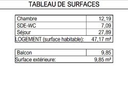 Ce T2 est situé au 1er et dernier étage. - Le séjour est spacieux et traversant : 27,89m2 exposé sud/ouest - Terrasse 9,85m2 (profondeur 1,87m) - Chambre 12,19m2 - Entrée, Salle d'eau douche à l'italienne, wc suspendus, placard à machines - Parking inclus.