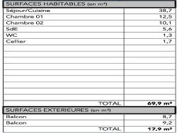 Ce T3 est situé au 5è et dernier étage et offre : - Séjour de 38,7m2 - Deux Chambres 12,5-10,1m2 - Salle d'eau avec douche 5,6m2 - wc séparé, cellier - Double terrasse 9,2-8,7m2 - Parking sous sol inclus.