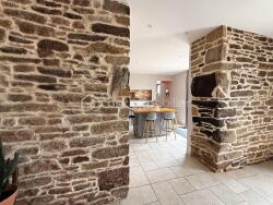 Une vaste pièce de vie lumineuse, avec ses magnifiques murs en pierre apparente, regroupant un salon-séjour ouvert sur une cuisine équipée.