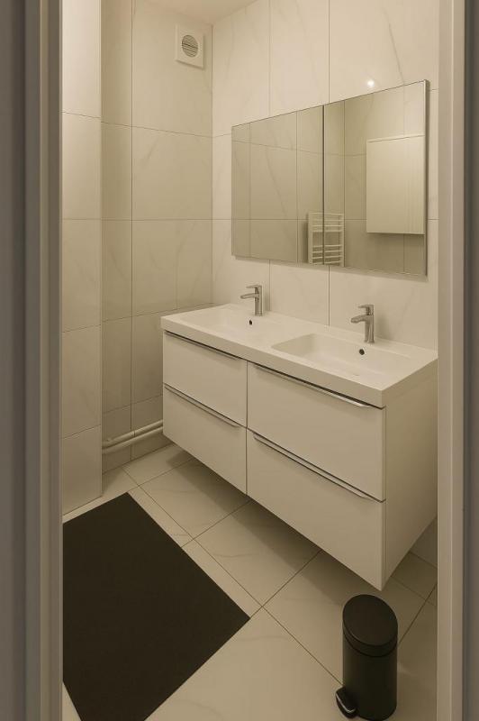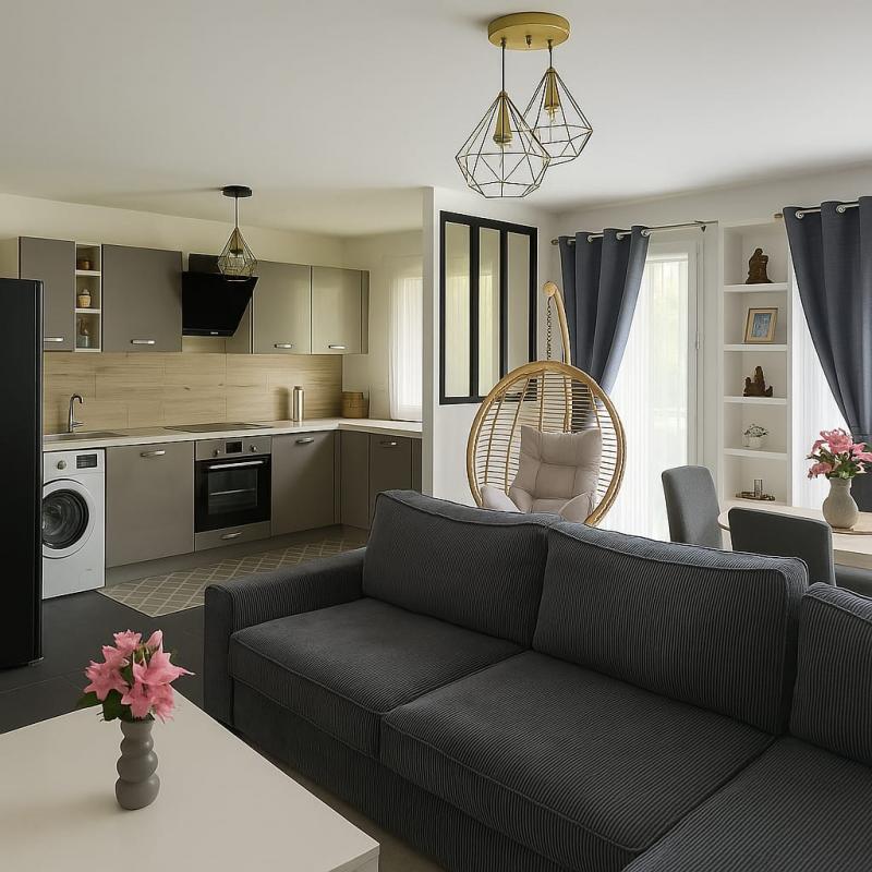 L'appartement est composé d'une entrée, d'un séjour donnant sur un premier jardin exposé SUD, une cuisine aménagée et équipée, une chambre avec salle d'eau, deux chambres donnant accès à un second jardin, une salle de bains, WC séparés.