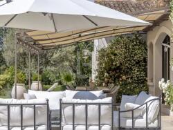 À l'extérieur, cette villa est entourée d'un vaste terrain paysager offrant intimité et tranquillité. Le jardin paysager accueille une grande piscine à débordement, un véritable havre de fraîcheur et de détente durant les chaudes journées estivales. Vous pourrez vous prélasser au soleil sur les chaises longues et sous les parasols mis à disposition. De plus, un court de tennis privé offre une vue panoramique imprenable sur les environs, vous permettant de pratiquer votre jeu tout en profitant de votre séjour.