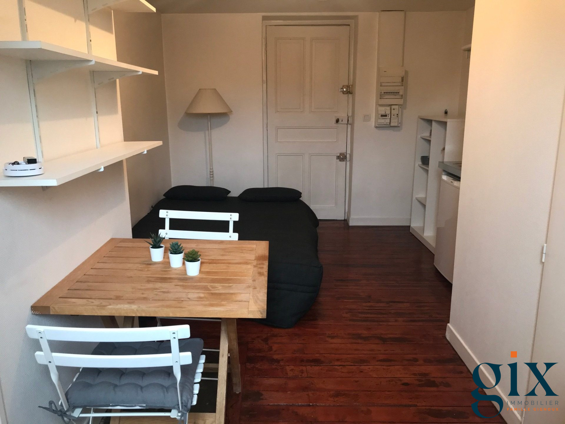 Ce studio est composé d'une entrée avec rangement (placard penderie). Une grande pièce de vie avec un kitchenette (2 plaques et placards). Une salle de douche avec vasque et emplacement machine à laver. Fenêtre en bois double vitrage - Chauffage individuel électrique.