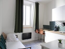 une pièce de vie, une cuisine entièrement aménagée, une salle de bains.