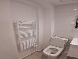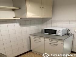 La cuisine est équipée d'un évier, plan de travail et meubles hauts et bas. La salle d'eau comprend une douche, meuble vasque, miroir avec point lumineux et WC.