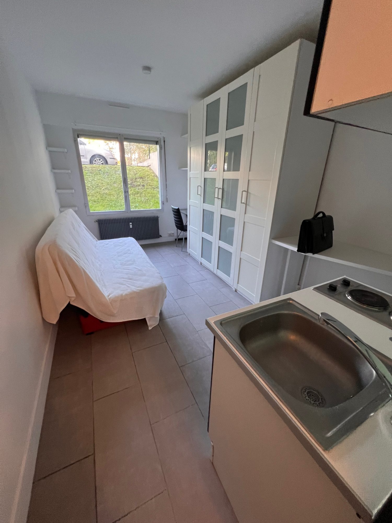 un séjour lumineux avec placard et coin kitchenette,