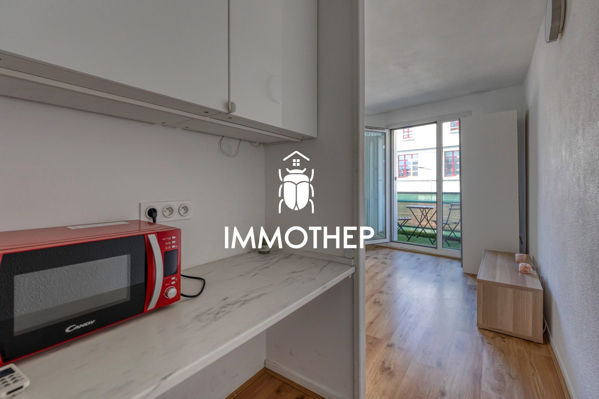 L'appartement se compose d'un espace de vie lumineux intégrant une pièce principale/chambre, une kitchenette équipée, et un coin dinatoire.Le tout s'ouvre sur une superbe terrasse ensoleillée, dont une partie est abritée, idéale pour installer un salon de jardin. Chauffage et eau chaude électrique.
