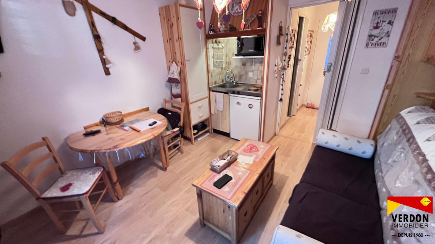 EXCLUSIVITE. ALLOS. Dans la copropriété recherchée Le VERDON, A PIEDS DES COMMERCES et de la base de loisir. Au 3e étage, studio cabine mansardé de 29 m² au sol, 22.5 m² carrez comprenant entrée, WC, salle de bains, kitchenette/séjour, COIN CABINE. 4 COUCHAGES. PARC arboré, aire de pique-nique. 591 lots, charges 100 euros/mois. REF 1605. APPELEZ NOUS au 04 92 83 10 53.