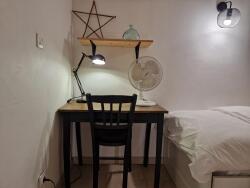 - A l'étage : lit, bureau, table de chevet.