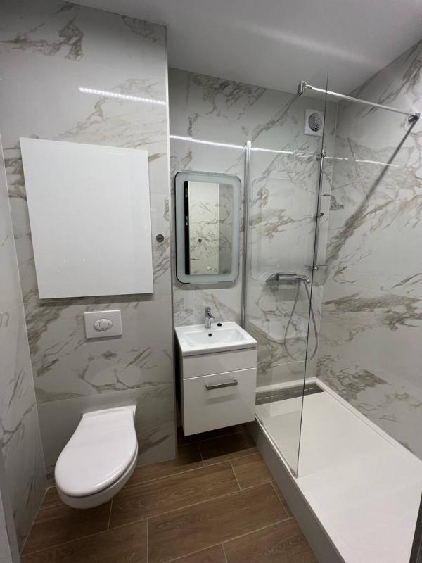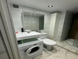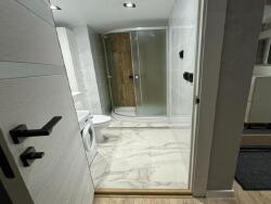 salle d'eau avec douche vitrée, lavabo, wc, machine à laver.