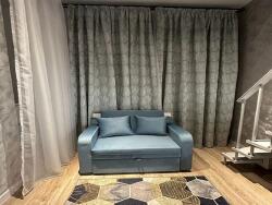 pièce principale avec canapé convertible bleu, commode, rideaux épais, parquet neuf. coin cuisine moderne sous mezzanine : plaques, four, hotte, frigo, bouilloire, nombreux rangements.