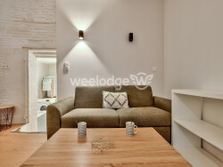 Le logement, entièrement meublé et équipé, se compose d'une pièce principale avec canapé convertible, table basse relevable idéale pour les repas ou le télétravail, télévision et grand placard de rangement, ainsi qu'une cuisine ouverte entièrement aménagée et équipée : réfrigérateur, plaque de cuisson, hotte, four, micro-ondes, plan bar avec tabourets et ustensiles de cuisine.