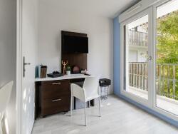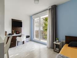 Situé au 2ème étage de la résidence étudiante La Rivière à Nantes, ce studio de 20,8 m² bénéficie d'une situation particulièrement agréable. Il donne sur une cour intérieure arborée, offrant un environnement calme et verdoyant, rare en résidence étudiante. Une porte-fenêtre ouvre sur une coursive extérieure qui permet de profiter de cette vue dégagée et de l'espace extérieur. La pièce principale de 17,4 m² est équipée d'une kitchenette fonctionnelle, d'un placard, d'un bureau, d'un lit et d'une télévision murale.