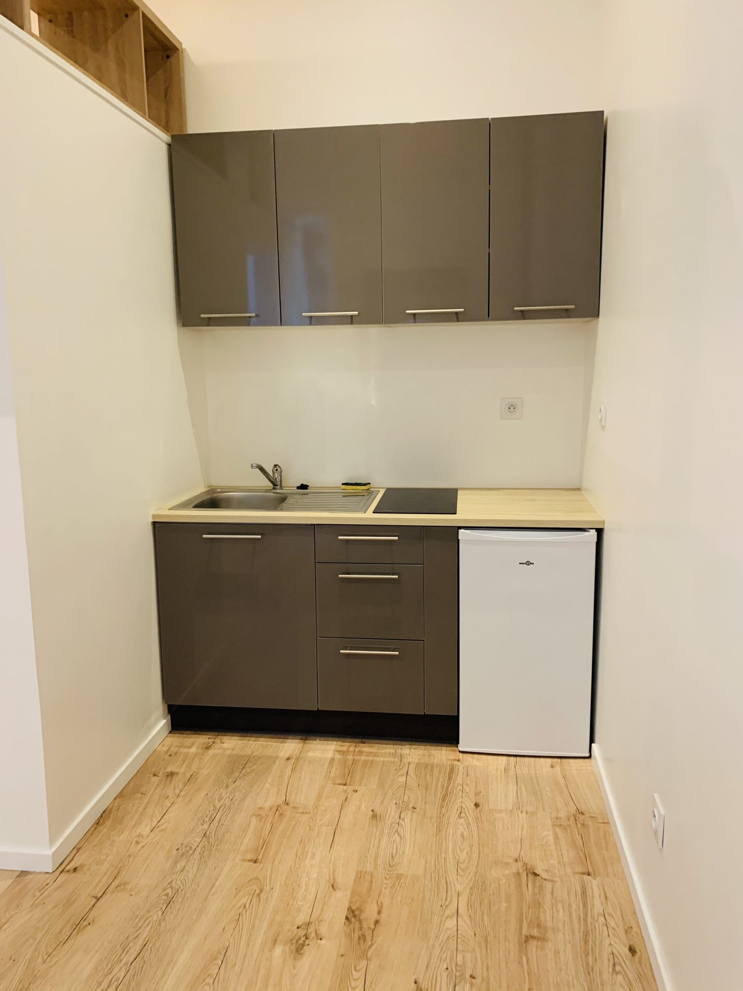 Un espace de vie comprenant une pièce principale avec cuisine équipée (micro-ondes, plaques de cuisson, machine à café), ainsi qu'une salle d'eau avec WC.