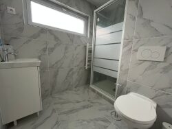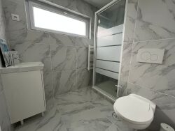 Canapé convertible en lit, pour optimiser l'espace, table basse, armoire, meuble Coin cuisine aménagé, entièrement équipée avec plaques de cuisson, hotte, micro-ondes, réfrigérateur. Salle de bains avec douche, miroir, lavabo, toilettes et rangements.