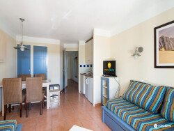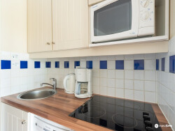 L'appartement offre une entrée avec coin cabine, une grande salle de bain accessible PMR avec WC, un coin cuisine et un séjour lumineux ouvrant sur une terrasse EXPOSÉE OUEST, parfaite pour profiter des fins de journée ensoleillées.