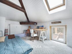 Empruntons maintenant l'escalier menant au niveau supérieur. Un charme fou se dégage lors de la montée, toujours dans la continuité de la pièce de vie. Ici, ce sont 2 grandes chambres et 1 plus petite qui peut faire office de bureau, salle de jeux, chambre bébé ou d'ami. 1 salle d'eau avec WC complète l'espace.