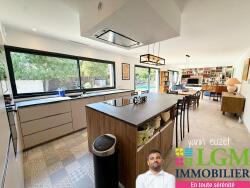 Dès l'entrée, vous serez séduit par une vaste pièce de vie baignée de lumière, ouverte sur le jardin grâce à de larges baies vitrées. La cuisine haut de gamme, parfaitement intégrée, prolonge l'espace avec harmonie.
