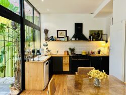 La pièce à vivre se compose d'un salon / salle à manger convivial sublimé par des matériaux nobles - bois massifs, métal noir et verrières atelier, et d'une cuisine équipée s'ouvrant elle aussi sur le patio, invitant à la détente et au partage.
