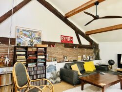 A l'étage, un second salon lumineux surplombe le patio grâce à la verrière. Cet espace, baigné de lumière, révèle toute la beauté de la charpente et des poutres apparentes, apportant une touche d'authenticité à l'ensemble. C'est un lieu de détente idéal, propice à la lecture, à la création ou simplement à la contemplation du jardin intérieur.