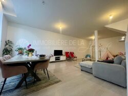 Ce superbe duplex d'environ 150 m² offre des prestations de qualité et des volumes généreux. Au rez-de-chaussée, vous serez accueilli par un hall d'entrée spacieux qui mène à un magnifique séjour de 60 m², lumineux et convivial. Vous y trouverez également une belle chambre à coucher, une salle de bain équipée d'une douche, d'une baignoire et d'un WC, ainsi qu'une cuisine aménagée et équipée.