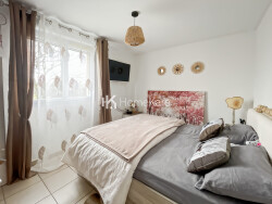 Venez découvrir cette charmante maison mitoyenne d'un côté d'environ 65m² idéalement située dans une résidence sécurisée avec piscine. Vous bénéficierez d'une entrée avec placard, d'une grande pièce de vie avec cuisine aménagée et équipée, le tout pour environ 30m². L'ensemble est baigné de lumière grâce à une baie vitrée qui donne accès à un jardin d'environ 170m². A l'étage, vous disposerez de 2 chambres spacieuses équipées de placards, d'une salle de bain et d'un toilette indépendant. Pour le stationnement, une place de parking est vendue avec le bien ainsi que d'un garage. Les plus : entièrement climatisé, aucun travaux à prévoir, piscine collective. N'hésitez pas à me contacter pour plus d'informations !