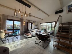 L'extérieur est tout aussi impressionnant avec un jardin de 900 m², parfait pour les amateurs de nature et les familles. Profitez des beaux jours sur la terrasse ou autour de la piscine, un véritable atout pour les étés ensoleillés.