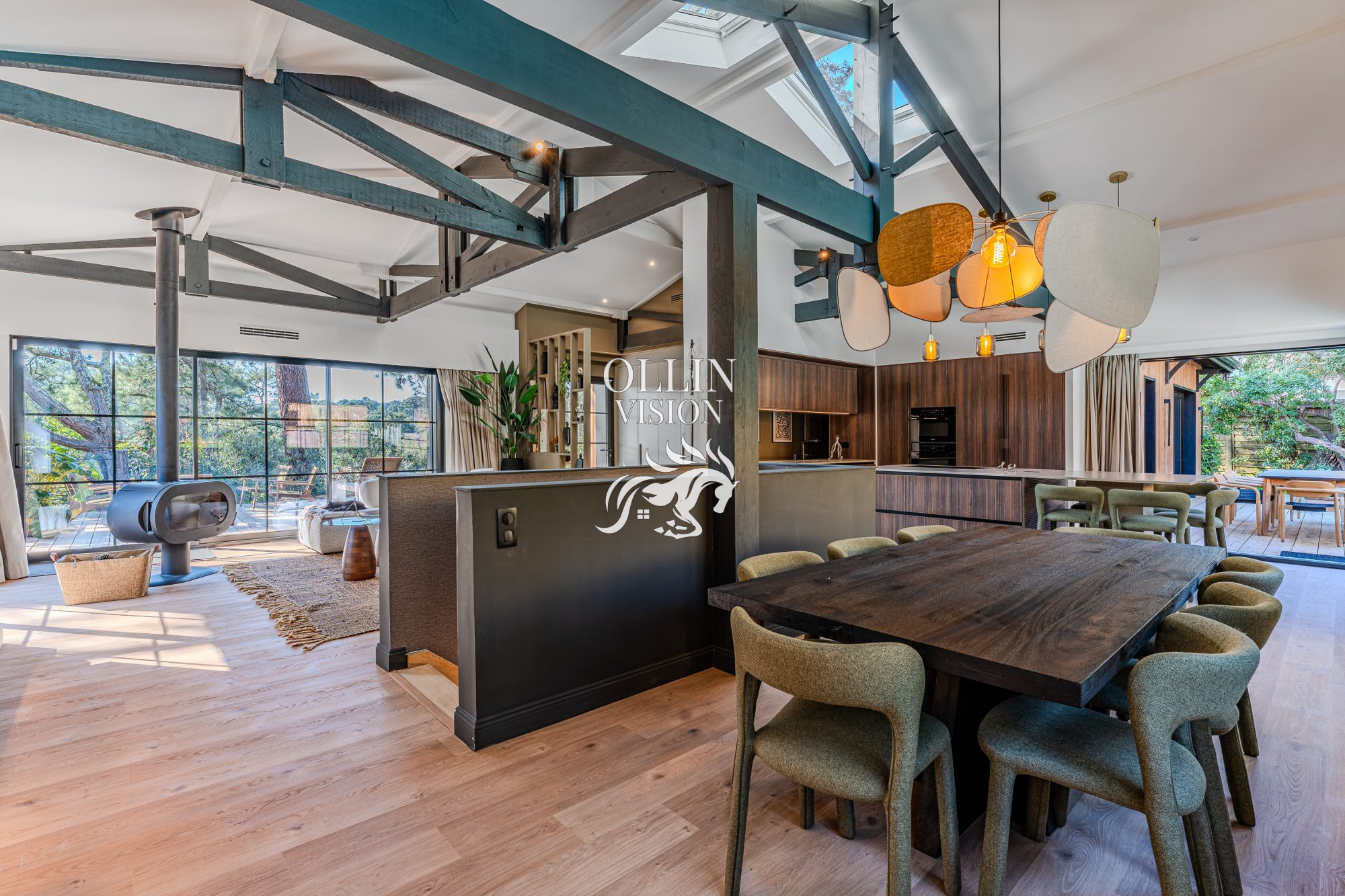 D'une superficie d'environ 170 m2 sur un terrain de près de 900 m2, la villa offre un vaste séjour avec cuisine ouverte entièrement équipée. Un large bow-window orienté plein sud, donnant sur le jardin, baigne l'espace de vie de lumière naturelle.