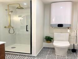 Salle d'eau : grande cabine de douche avec colonne thermostatique, ballon d'eau chaude connecté dernière génération.