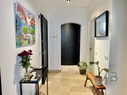 L'appartement s'ouvre sur une entrée fonctionnelle avec rangements, suivie d'une grande pièce de vie lumineuse donnant accès à un balcon. La cuisine aménagée et équipée se distingue par son plan de travail en marbre et ses finitions soignées. Un couloir dessert le coin nuit et intègre un grand dressing sur mesure, idéal pour optimiser le rangement. La partie nuit propose deux chambres : l'une avec terrasse privative, l'autre avec dressing sur mesure. Une salle de bains moderne avec douche à l'italienne et WC, ainsi qu'un second WC séparé, complètent l'ensemble.