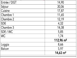 - séjour/cuisine 48m2 expo sud, ouest et est. - balcons 8,66+5,97m2 - chambres 11,65-12,19m2, salle de bains, wc séparés - suite parentale 14,38m2 avec salle d'eau double vasque/wc attenante 5,85m2 - placards - double parking et cellier inclus