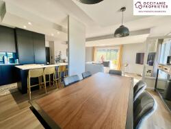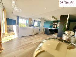 La pièce de vie de 53 m2, baignée de lumière, s'ouvre sur une cuisine contemporaine équipée et sur une vaste terrasse avec piscine et cuisine d'été.