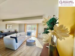 La pièce de vie de 53 m2, baignée de lumière, s'ouvre sur une cuisine contemporaine équipée et sur une vaste terrasse avec piscine et cuisine d'été.