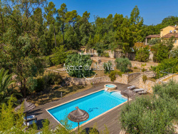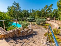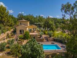 EXCLUSIVITE. A Seillans, superbe villa moderne (2008), idéalement installée sur 3300m2 de terrain clos. Surélevée au-dessus d'un jardin paysager, où serpentent des grands murs en pierres, et où se côtoient vieux oliviers, palmiers et chênes. Superbe piscine traditionnelle, avec plage en bois, et jacuzzi intégré. La maison se divise en deux parties, reliées par une entrée couverte (porche), la partie principale au Sud, et un appartement indépendant côté Nord. Côté principal, la maison offre un hall d'entrée, donnant sur la partie séjour salle à manger. Grandes baies vitrée, cheminée centrale, et grandes hauteurs sous plafond. De l'autre côté, une grande cuisine américaine, donnant accès sur la terrasse couverte côté Est. Arrière cuisine. A droite du hall, une chambre invités de plain pied, avec dressing et salle de bain. A l'étage, la suite parentale, avec salle de bain (douche et baignoire) monumentale, et espace nuit. Terrasse extérieure privative.