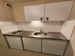 Un appartement T1 comprenant une entrée avec kitchenette aménagée et semi équipée (plaque de cuisson, frigidaire), un séjour avec placard, une salle de bains avec un WC.