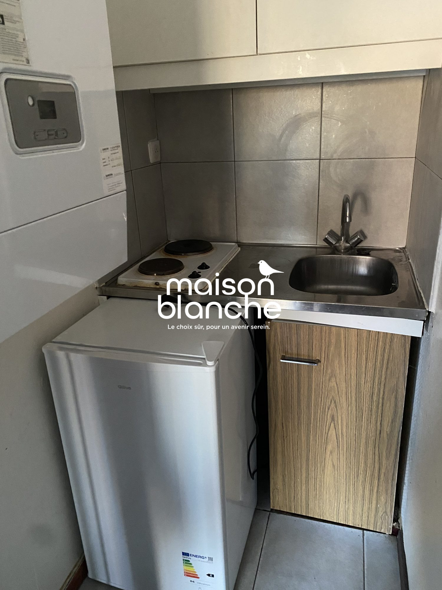 Au premier étage d'un immeuble pierre, T1 bis de 26,92 m² composé d'une pièce principale avec cuisine aménagée et équipée ouverte, mezzanine, salle de bains avec wc.