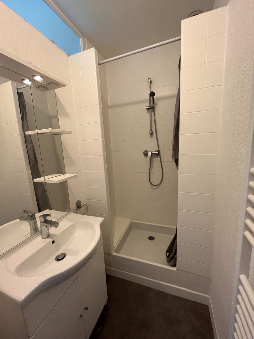 Au premier étage d'un immeuble pierre, T1 bis de 26,92 m² composé d'une pièce principale avec cuisine aménagée et équipée ouverte, mezzanine, salle de bains avec wc.