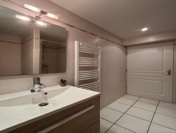 L'appartement se compose comme tel : un petit hall d'entrée distribue la salle d'eau, moderne, avec un grand placard mural.