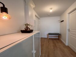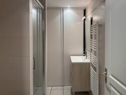 L'appartement se compose comme tel : un petit hall d'entrée distribue la salle d'eau, moderne, avec un grand placard mural.
