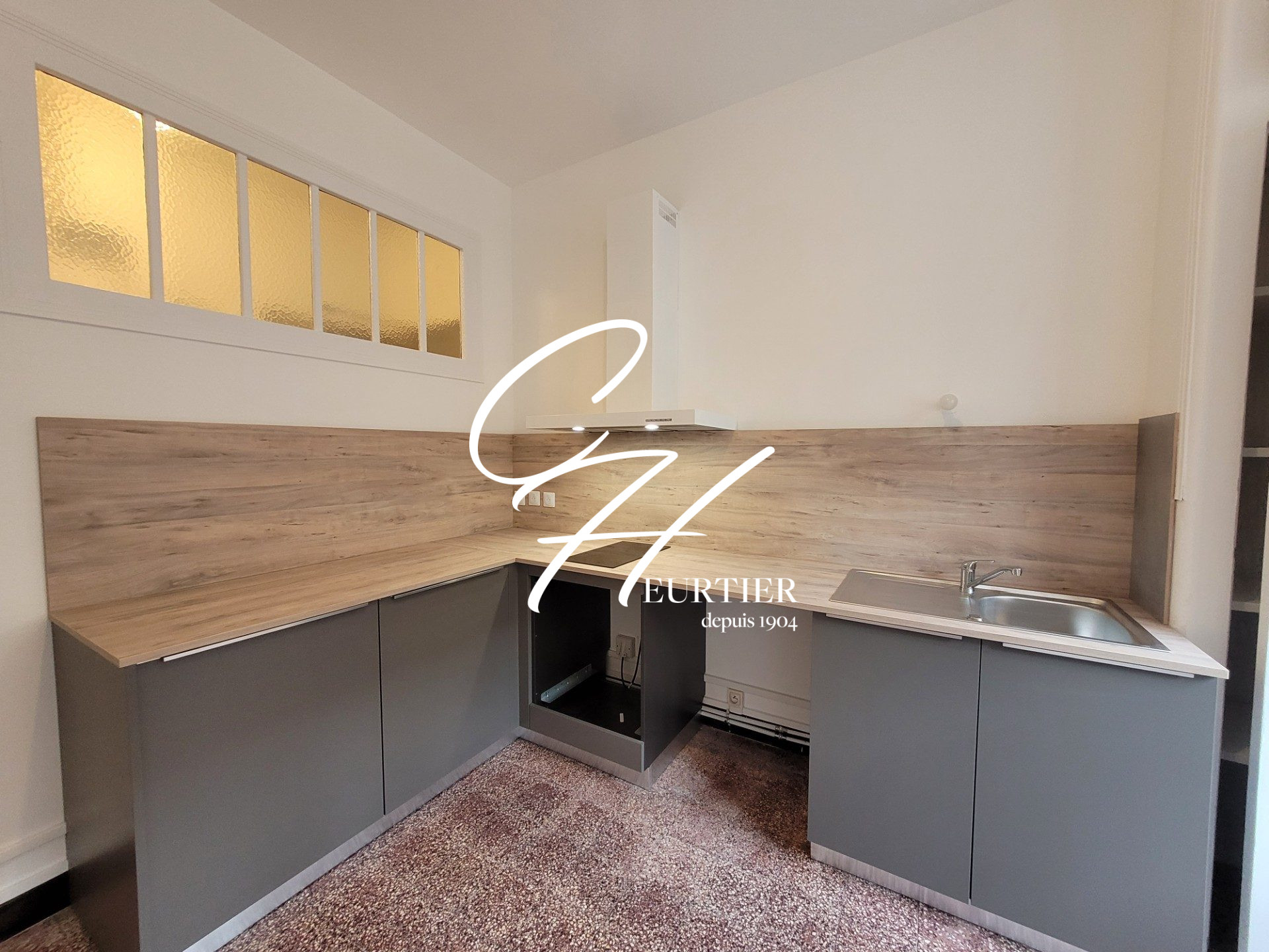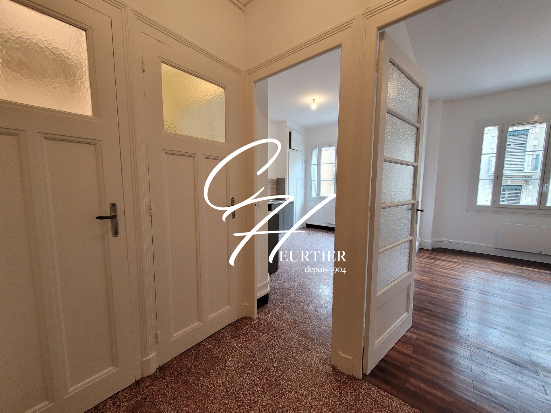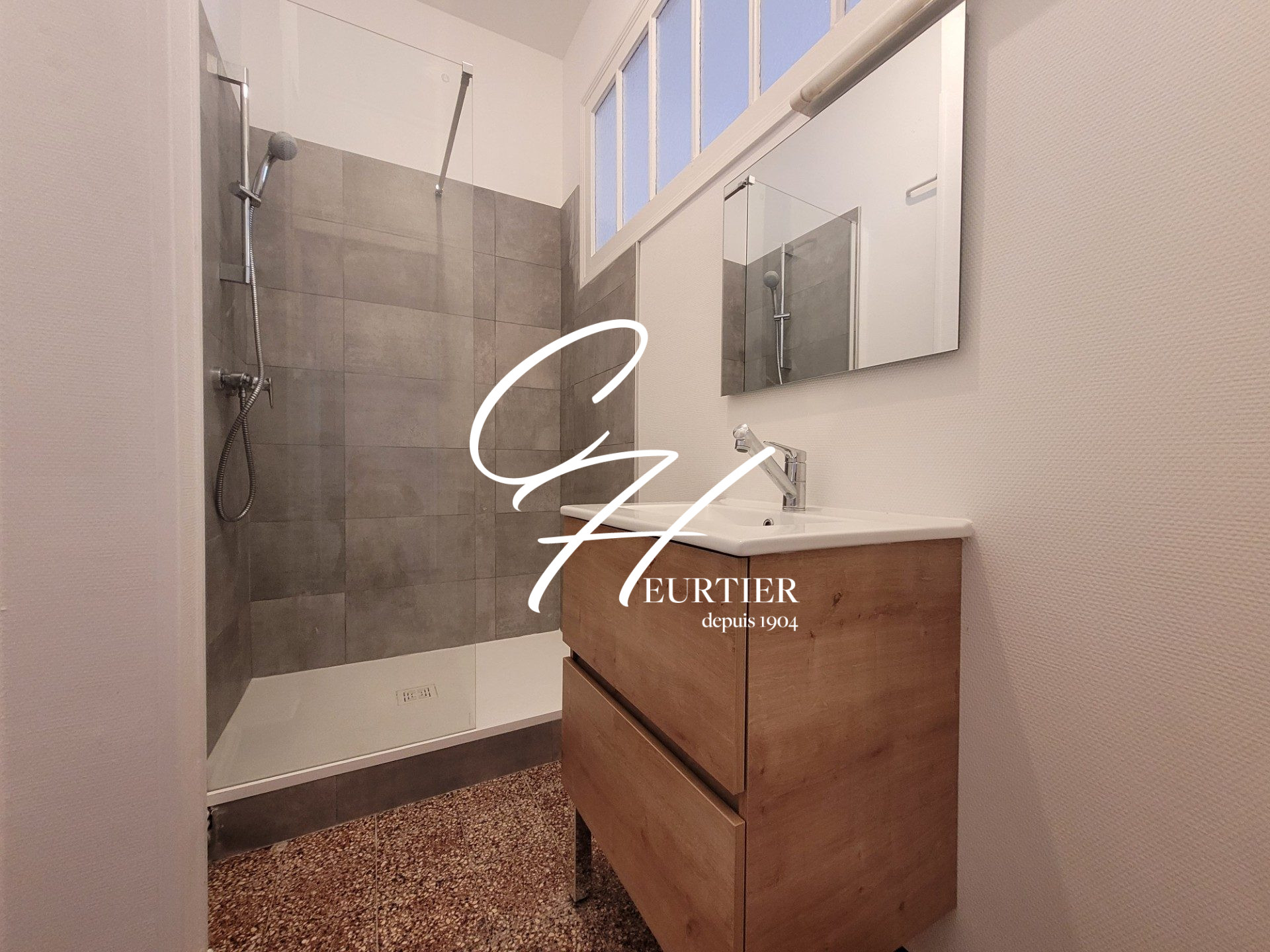 L'appartement se compose comme tel : un petit hall d'entrée distribue la salle d'eau, moderne, avec un grand placard mural.