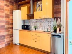 Cuisine carrelée dans tons ocres, très propre, tout équipée : grand frigo-congélateur, plaques vitrocéramiques, hotte, micro-ondes, lave-vaisselle, vaisselle complète, placards hauts et bas.
