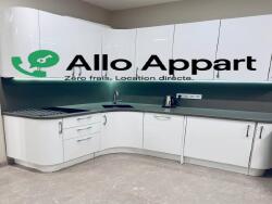 un grand espace salon équipé d'un canapé convertible et d'une télé murale. Un coin bureau avec une chaise ergo. Cuisine séparée avec tout le nécessaire, coin repas.